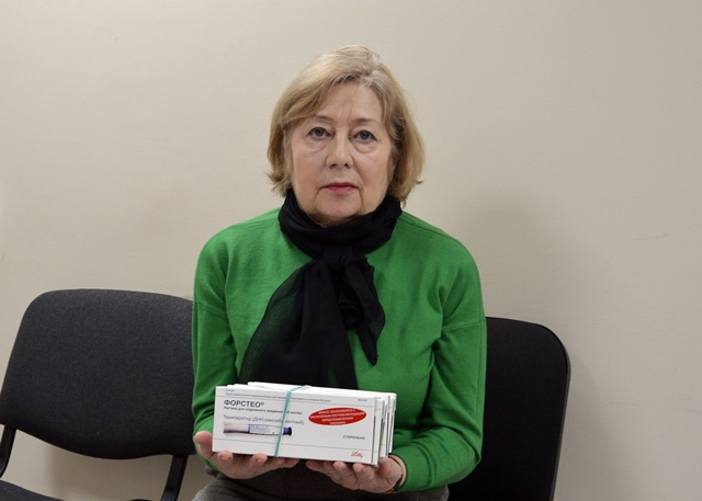 Остеопороз нашей подопечной диагностировали очень давно, он стал следствием длительного приема гормональных препаратов для лечения красной волчанки. Все показанные ранее линии терапии уже пройдены, но результата, к сожалению, не дали. Хрупкость костей настолько сильная, что требуется радикальное лечение, а именно — курсовой прием «Форстео». Оно и было назначено на недавнем обследовании.
