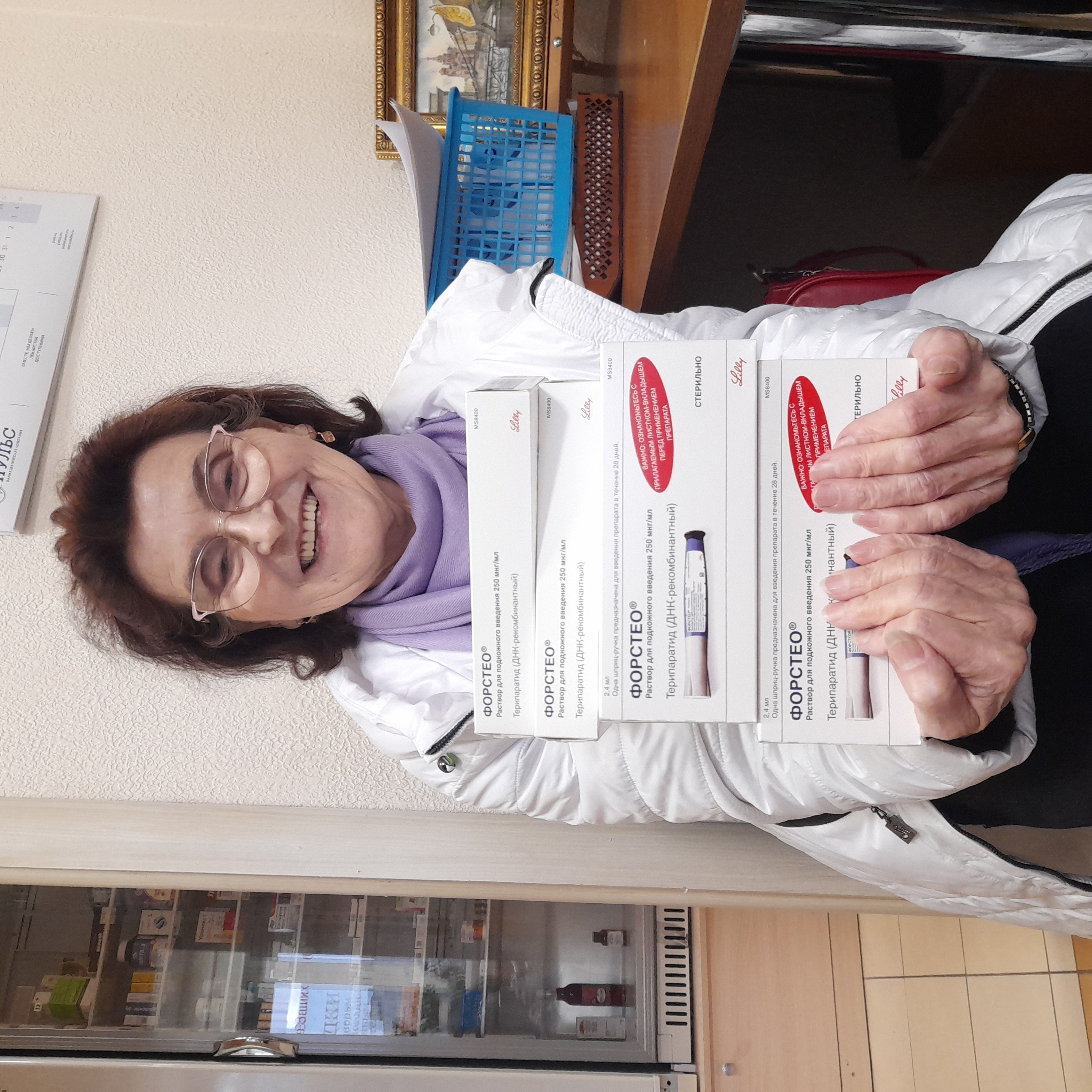 18 ноября 2025. Друзья, мы передали Валентине Владимировне двухлетний запас дорогостоящего препарата для курсового лечения тяжелого прогрессирующего остеопороза.