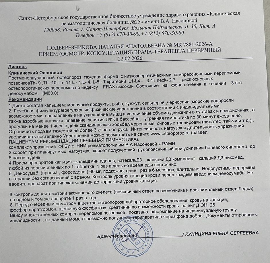 Подопечная узнала, что у нее хрупкие кости в пятьдесят пять лет, когда одно из ребер треснуло от простого объятия. Но обратила внимание на проблему лишь несколько лет спустя, когда, занимаясь физкультурой, получила компрессионный перелом позвоночника. Тогда в первый раз сделала денситометрию и узнала, что у нее остеопороз в тяжелой степени, требующий незамедлительного лечения.