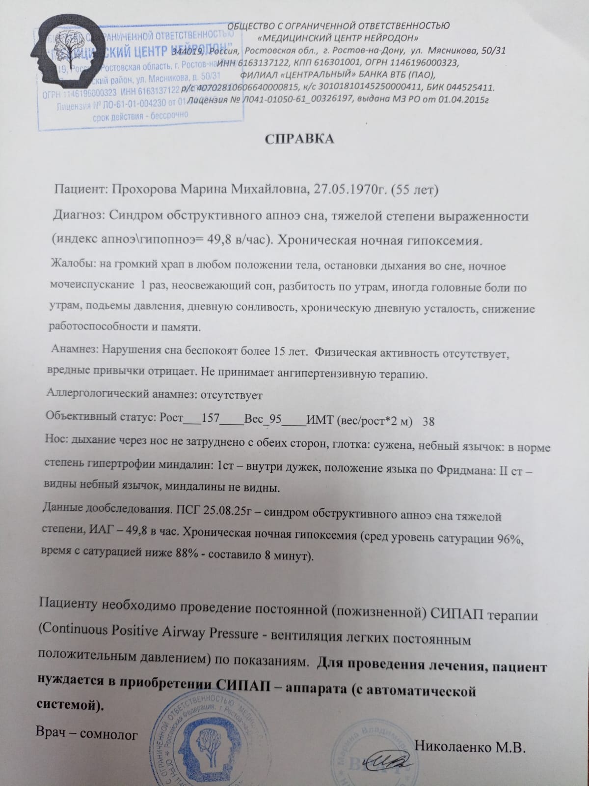На углубленном обследовании в клинике был выявлен синдром обструктивного ночного апноэ, сомнография выявила двести тридцать три остановки дыхания за ночь и тяжелое кислородное голодание. Там же, в больнице, Марина Михайловна несколько дней спала в специальном СИПАП-аппарате, контролирующем дыхание и предотвращающем его остановки, и почти сразу почувствовала значительные улучшения.