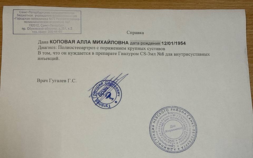 Подопечная нуждается в эндопротезировании, но из-за тромбоза операцию проводить нельзя. Единственное, что показано в этой ситуации — внутрисуставные инъекции, которые не только снимут болевой синдром, но и улучшат подвижность суставов, создав длительный терапевтический эффект.