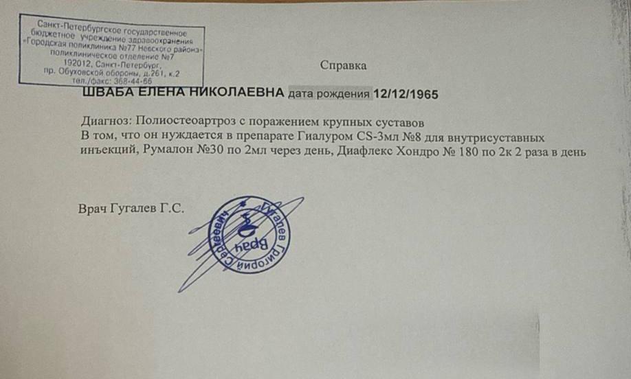 У Елены Николаевны — тяжелый полиостеоартроз, однако замена суставов ей не рекомендована, так как состояние сердца и сосудов оставляет желать лучшего. К тому же за ней просто некому ухаживать в период длительной реабилитации. Лечащий врач назначил курсовое лечение внутрисуставными инъекциями — это вернет суставам подвижность и значительно уменьшит болевой синдром.